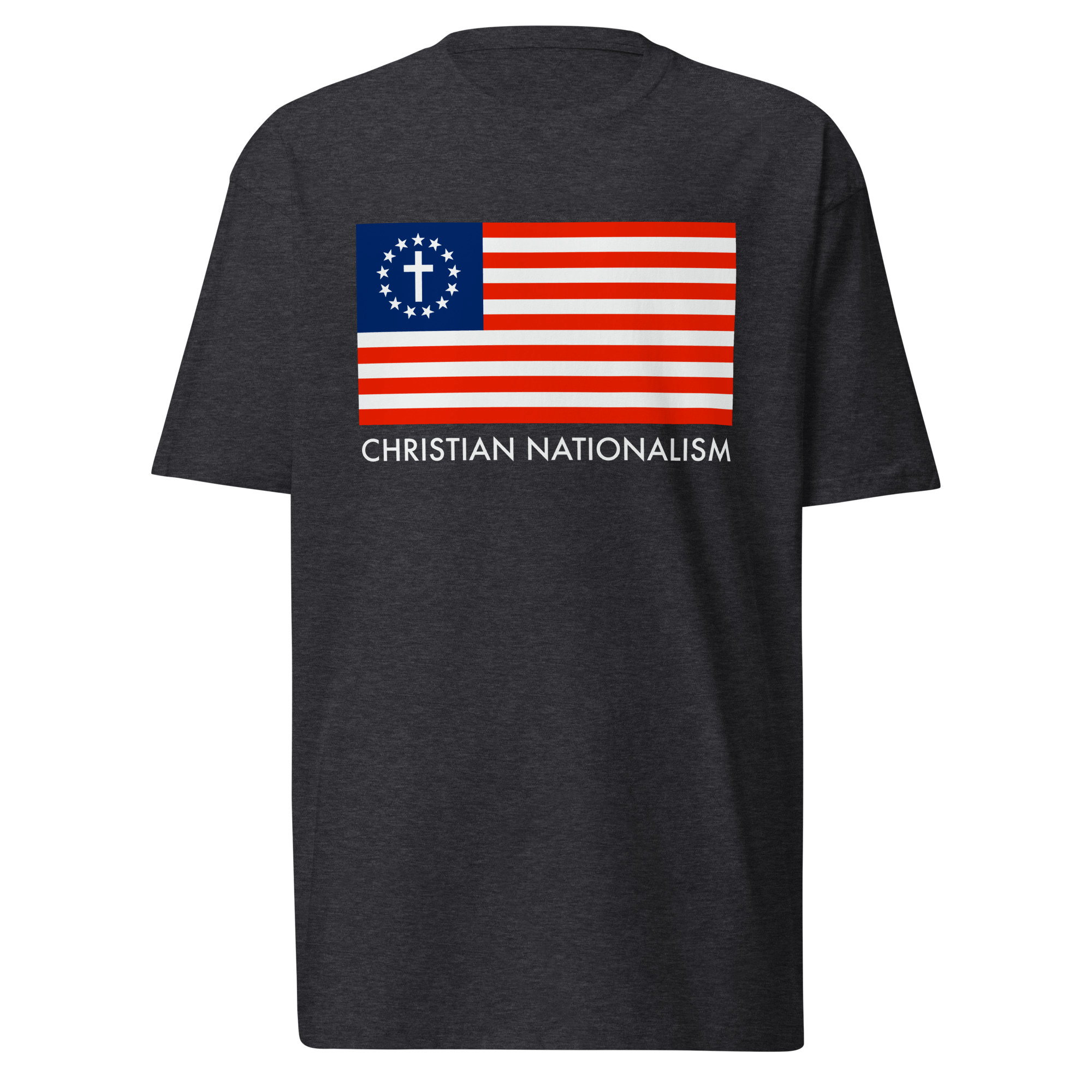 Betsy Ross Christian Nationalist T-Shirt 100% combed ring-spun cotton Charcoal Heather and Carbon Grey is 60% cotton and 40% polyester Fabric weight: 6.5 oz/yd² (220 g/m²) Yarn diameter: 20 singles Relaxed fit Side-seamed construction 1″ × 1″ (2.5 cm × 2.5 cm) ribbed lycra collar Single-needle edgestitch ⅞″ (2 ⅖ cm)
