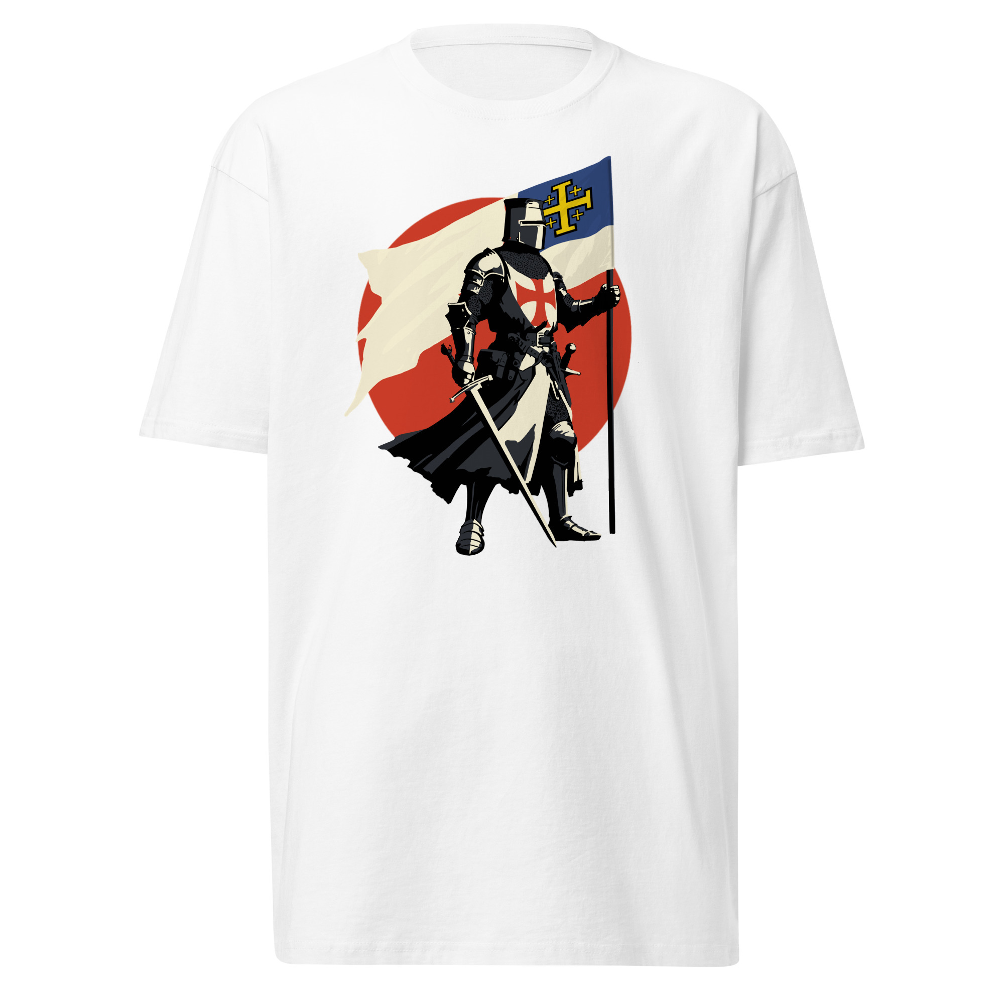 Crusader T-Shirt 100% combed ring-spun cotton Carbon Grey is 60% cotton and 40% polyester Fabric weight: 6.5 oz/yd² (220 g/m²) Yarn diameter: 20 singles Relaxed fit Side-seamed construction 1″ × 1″ (2.5 cm × 2.5 cm) ribbed lycra collar Single-needle edgestitch ⅞″ (2 ⅖ cm)